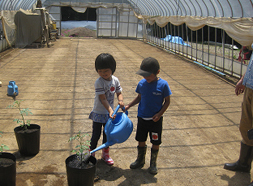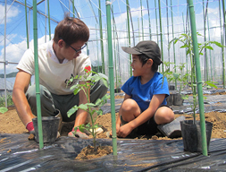「今日はお子さまだけのプランですが、特別に大人の方も農園に入っていただいて定植作業を体験していただけます、いかがですか?」