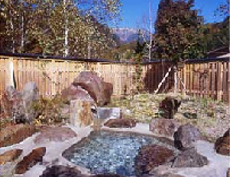 まほろばには4つの貸しきり露天風呂があります。当館のお風呂は地元中尾温泉を使った源泉かけ流しの天然温泉でございます。露天風呂からは錫杖岳を望むことができますよ